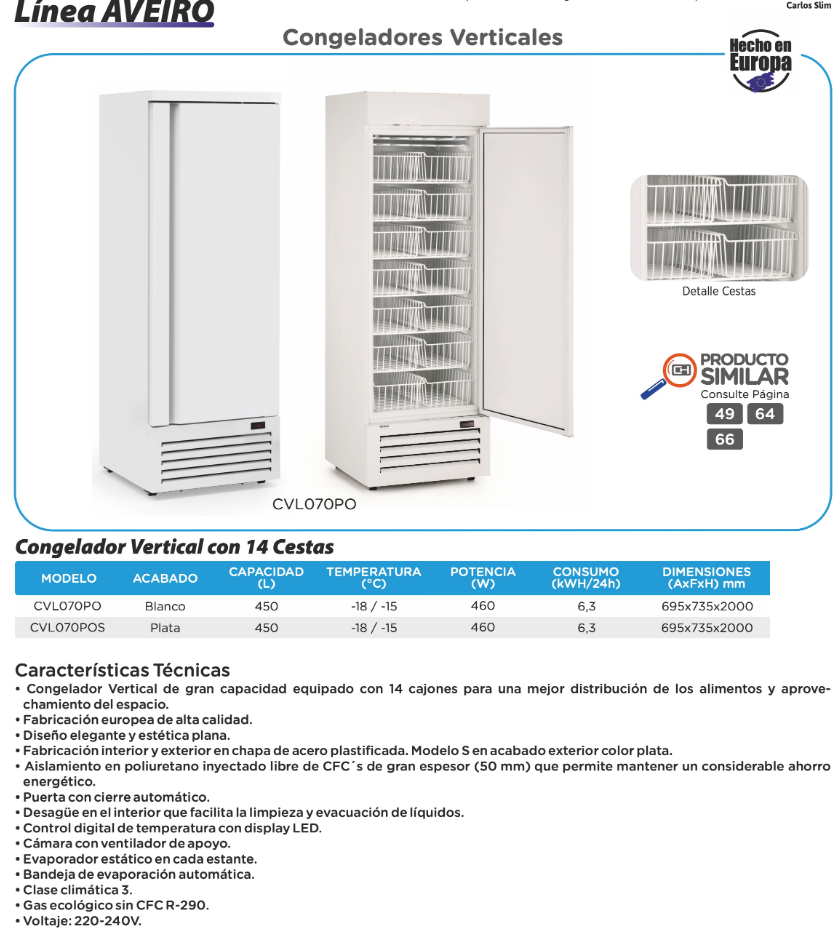 ARMARIO CONGELACIÓN 450 LITROS LACADO BLANCO 700X700X2070H MM CON 14 CAJONES AVEIRO CVL70PO. 134KG.