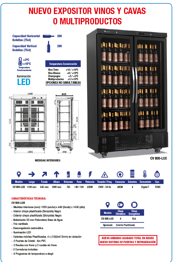 ARMARIO DE VINOS DE 266 A 280 BOTELLAS LUZ LED MULTITEMPERATURA CASFRI MODELO CV800-LUX