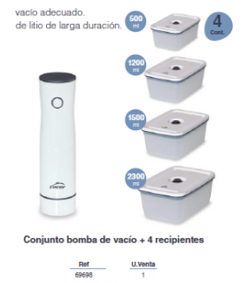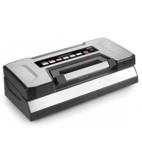• Construida en acero inox, de gran funcionalidad y robustez. Apta para la venta al detalle o uso privado• Barra soldante de 5 mm.• Funciona con bolsas gofradas.• Placa electrónica con 3 programas (1 ciclo de trabajo libre, 1 automático de 10 seg. de vacío y 1 automático de 25 seg. de vacío).• Tiempo de sellado por defecto: 3,5 segundos con regulación variable de medio segundo en medios egundo.• Vacuómetro de serie.•El kit para aspiración en recipientes opcional incluye 3 vasos de 0.25 l., 0.5 l. y 0.75 l. Ideal para envasar líquidos.