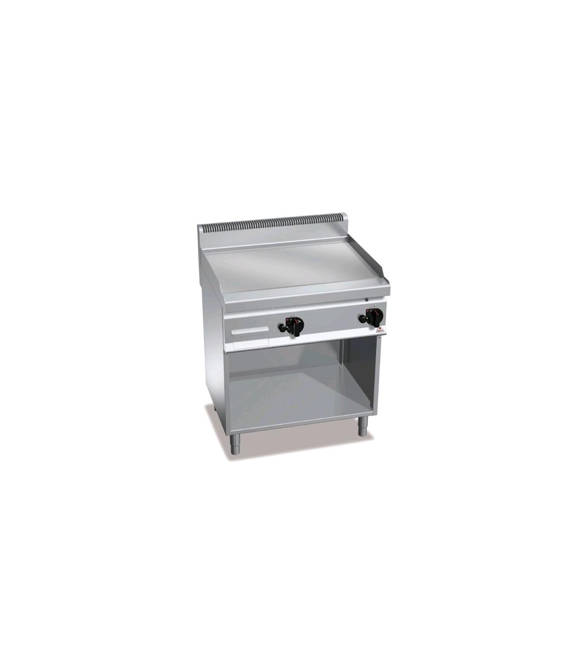Plano de trabajo y paneles frontales de acero inoxidable AISI 304. Quemadores tubulares de llama auto- estabilizada de gran superficie para una mayor uniformidad de distribucio´n del calor. Regulacio´n de la potencia erogada por medio del grifo de funcionamiento continuo. Llama piloto y va´lvula de seguridad de termopar. Encendido piezoele´ctrico con proteccio´n en silicona. Temperatura ma´xima de ma´s de 300°C. Placa lisa de acero satinado con proteccio´n de salpicaduras a nivel del borde. Dos zonas con mandos separados para una regulacio´n independiente y o´ptima de la temperatura. Superficie de coccio´n ligeramente inclinada con orificio de descarga de grandes dimensiones y transportador en contenedor especial con cierre herme´tico de li´quidos. Pies regulables (versio´n con mueble).