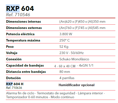 Con capacidad para 4 bandejas 600 x 400 mm, el RXP604 ofrece la versatilidad necesaria para trabajar tanto en productos de panadería como platos para la restauración. Su panel de mandos sencillo e intuitivo facilicta el contro de tiempo y temperatura, permitiendo al profesional trabajar de manera cómodoa y eficiciente.