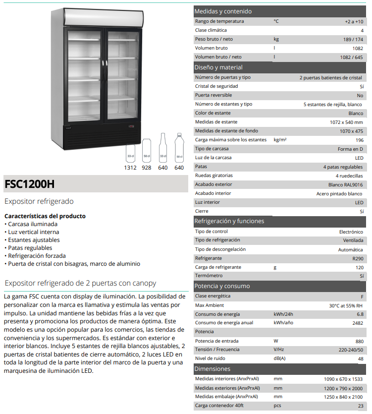 La gama FSC de expositores refrigerados de 2 y 3 puertas con un display iluminado ofrece una excelente calidad de construcción a un precio competitivo. Puedes escoger entre armarios con el exterior blanco o negro, con puertas de cristal con marco de aluminio negro, puertas batientes o deslizantes. Los estantes son ajustables, con lo cual la gama FSC se convierte en una solución flexible. Conseguirás una excelente presentación de producto, combinada con un potente sistema de refrigeración asistido por ventilador controlado por un termostato electrónico. Muchos modelos también están disponibles sin display (gama FS).