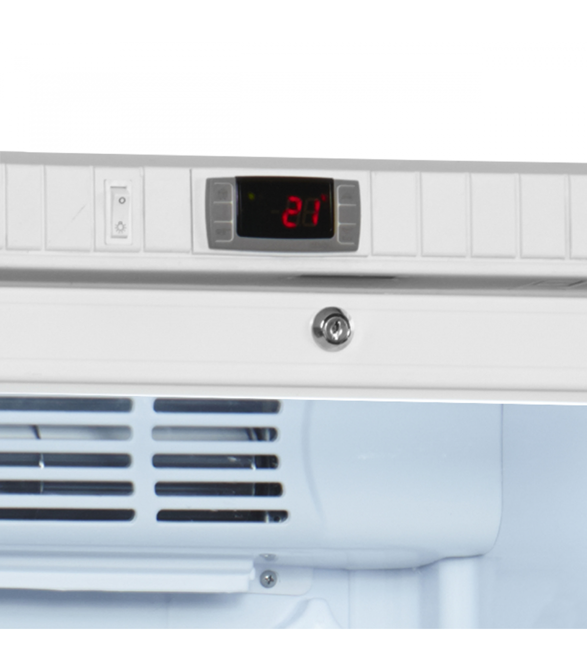 Puerta batiente de cristal|Termostato electrónico|Alarma acústica|Conexión de alarma externa|Estantes ajustables|Descongelación automática|Patas regulables|Refrigeración asistida por ventilador|Luz interior LED