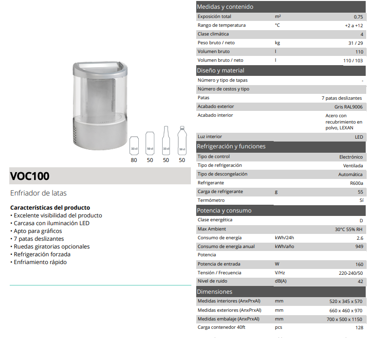 El enfriador de latas VOC ofrece una gran visibilidad del producto y es ideal para estimular las ventas por impulso. Con un display iluminado, es una opción obvia para que la marca atraiga la atención de los clientes. Dispone de un eficaz sistema de refrigeración ventilada para garantizar que siempre tengas bebidas frías a la vista. Viene con 7 pies deslizantes, pero si necesitas una movilidad aún mayor, también hay disponibles ruedas como opción.
