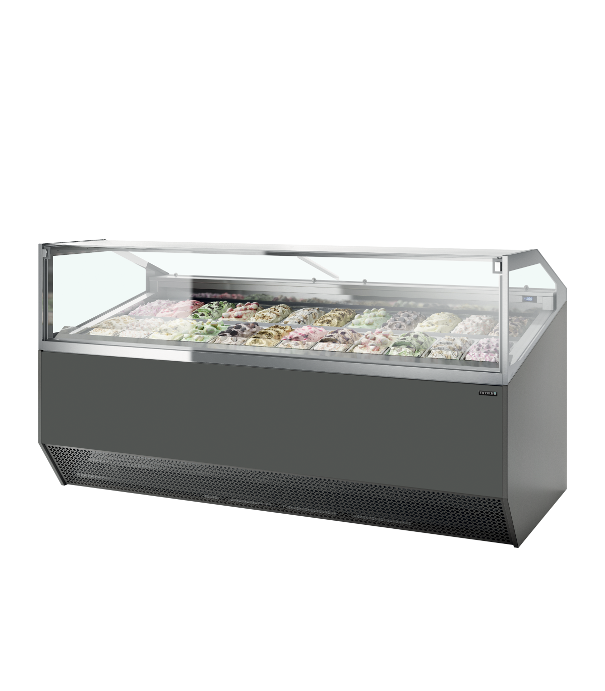 La gama Super Capri de vitrinas para helados ventiladas es ideal para la exposición de helados. Con grandes paneles de cristal e iluminación LED, la presentación de los productos resulta sumamente atractiva. El expositor en ángulo de 11° optimiza la visión, mientras que la refrigeración de doble flujo de aire garantiza una distribución uniforme de la temperatura sobre cada fila de bandejas. El cristal calefactado evita la condensación, mientras que el cristal frontal abatible permite una fácil limpieza. Disponible en varios tamaños.