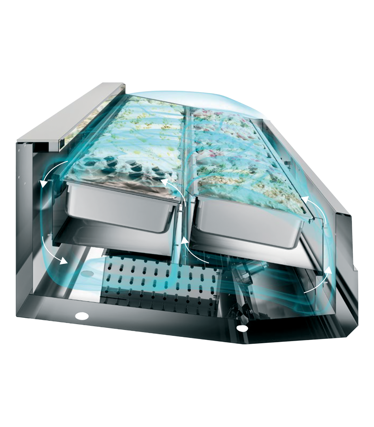 Automático|El doble flujo de aire asegura una refrigeración uniforme de 2 filas de bandejas|Luz interior LED con interruptor|Cubierta angular (11°) para una mejor exposición|Apta para bandejas Napoli (no incluidas)|Cristal calefactado para prevenir la condensación|Cristal abatible para una fácil limpieza|Puertas deslizantes traseras acrílicas hacia la zona de exposición|Lavado de cucharas opcional (requiere conexión de agua y desagüe)