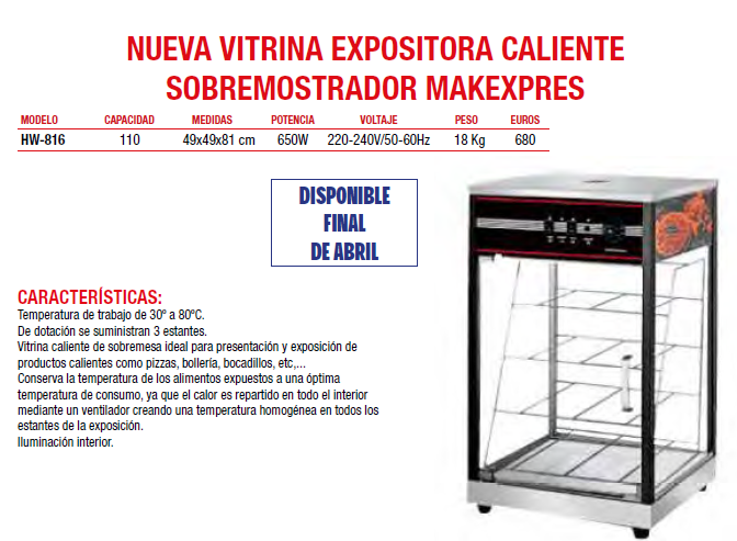 VITRINA CALIENTE SOBREMOSTRADOR MEDIDAS 490x490x810MM MODELO HW-816