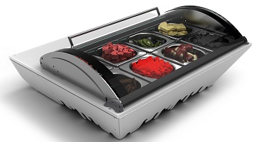 VITRINA REFRIGERADA CON TAPA TOPING BOX SAYL 785X675X 525/300MM MOD. TBT Simpático diseño de expositor refrigerado, muy versátil para heladerías, yogurterías o buffets desayuno. Acabado en forma de diamante para la optimización del espacio visual. Capacidad para 8 bandejas 1/6x65 mm incluidas. Posibilidad de cubetas de metracrilato transparente .